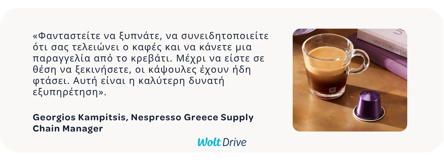 Το ταξίδι της Nespresso Greece με το Wolt Drive αποδεικνύει τον σημαντικό αντίκτυπο που μπορεί να έχει ο σωστός συνεργάτης παράδοσης στην ικανοποίηση των πελατών και στην ανάπτυξη της επιχείρησης.