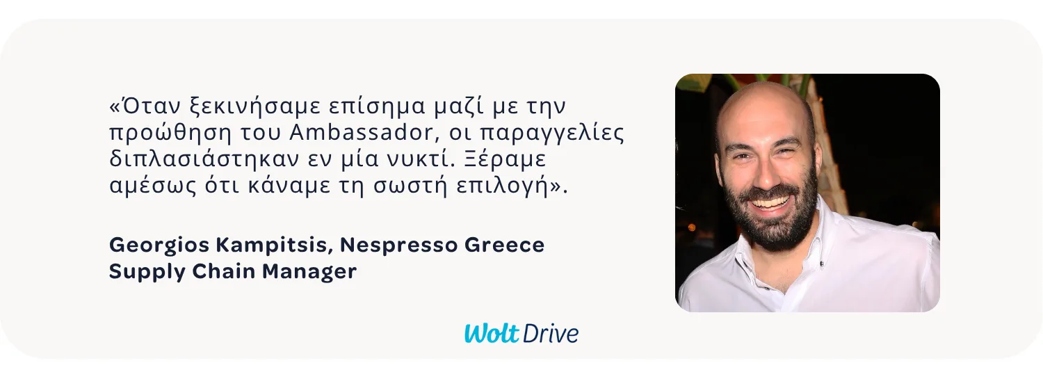 «Το Wolt Drive προσέφερε ακριβώς αυτό που χρειαζόμασταν, γρήγορη ενσωμάτωση με τα συστήματά μας, αξιόπιστη παράδοση και διαφανείς διαδικασίες», λέει ο Γεώργιος.