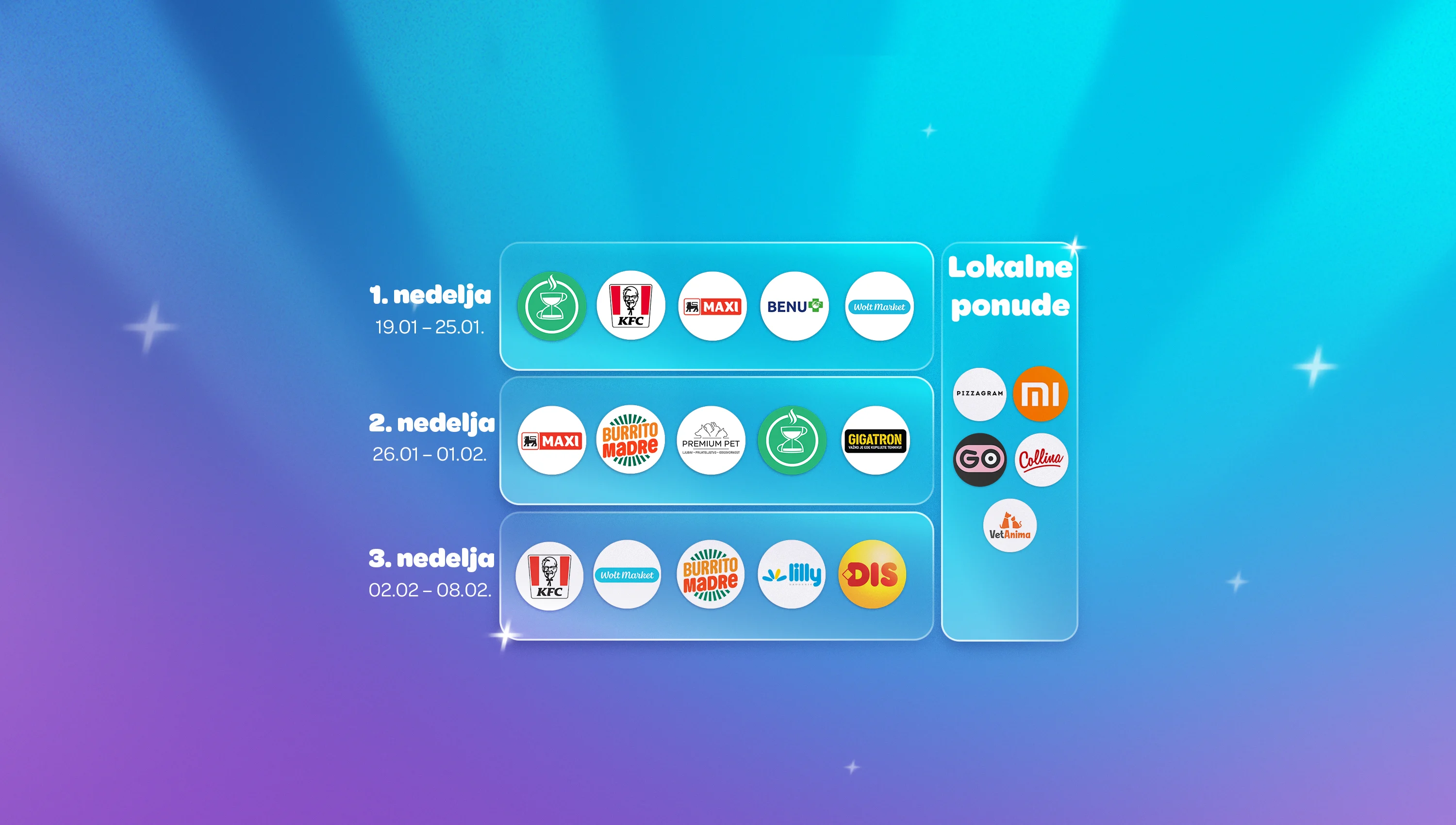 Uživaj u Wolt+ Weeks ponudama od 19.1. do 8.2. Pridruži se odmah i dobijaš dostavu bez naknada i ponude samo za članove, koje se ažuriraju svake nedelje! Sve u jednoj mesečnoj pretplati.