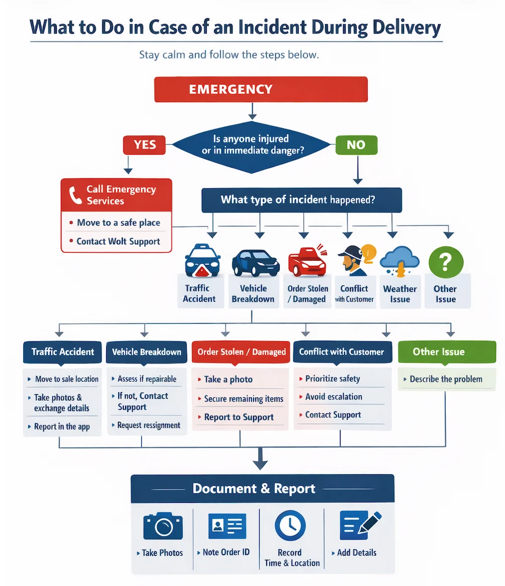 No, Wolt’s insurance does not cover damage to your own property, such as your bike, scooter, car, phone, or the items you are delivering. The insurance only covers personal injuries you suffer as a result of an accident while working, and third-party liability for injury or damage you may cause to others when using a non-motorised vehicle.